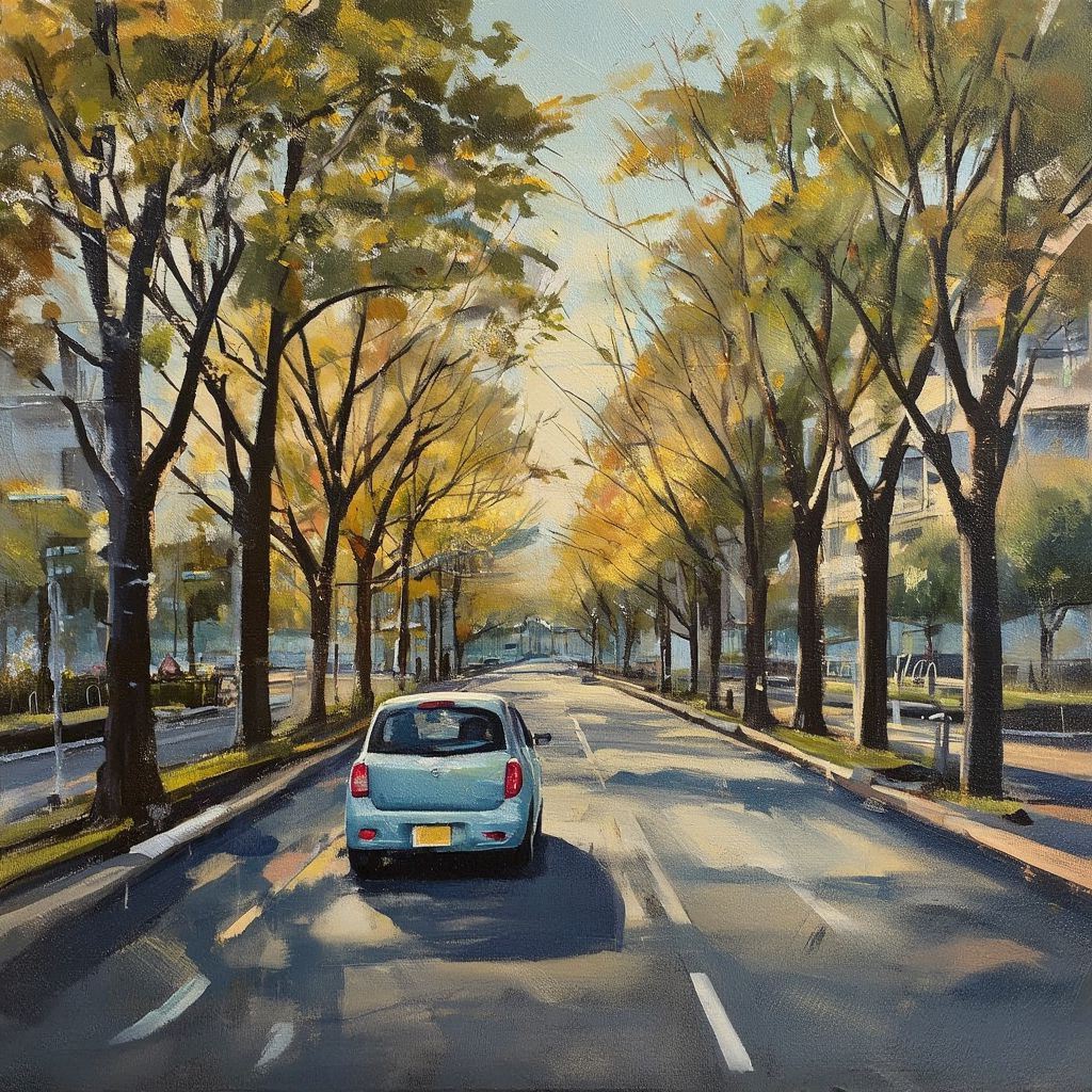 次の道路も右側車線で走行され、街路樹の通りから右手にベージュの建物群が見えてきますとそろそろ右折です。